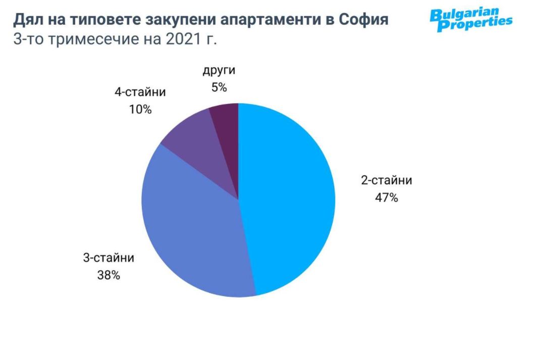 През третото тримесечия на 2021 г. делът на закупените 2-стайни жилища е 46%. Тристайните са 38% от закупените апартаменти, а делът на 4-стайните за запазва на 10%. Средната площ на закупените жилища е 90 кв.м.