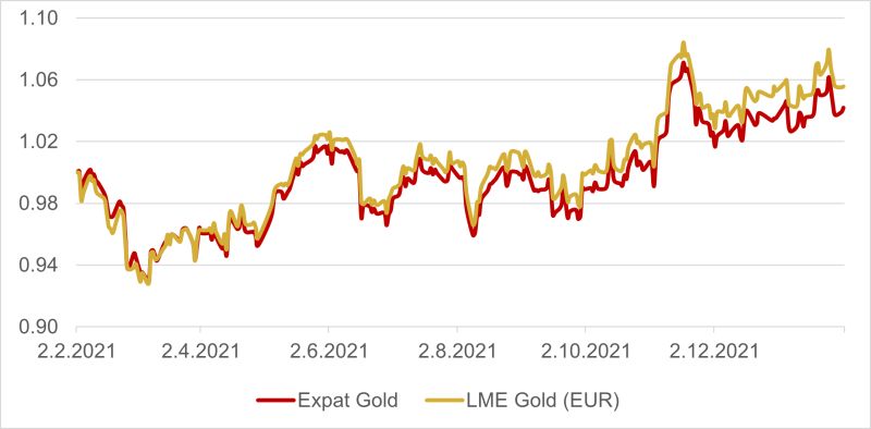 Графика 2. Движение на цената на Expat Gold спрямо неговия бенчмарк LME Gold Spot (EUR), 12 месеца назад